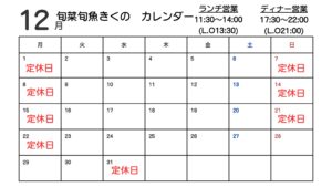 今月の休業日